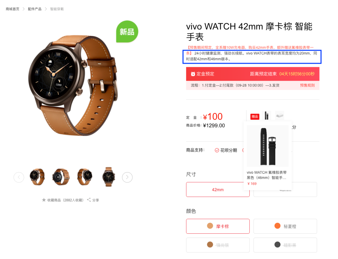 细节上,有小伙伴问vivo Watch官网预定界面显示 购买42mm版送的是46mm版的黑色氟橡胶表带,是不是乌龙?刚看了下发现有小字注明,vivo Watch表带的表耳宽度均为20mm,同时适配42mm和46mm版本,所以表带是通用的。