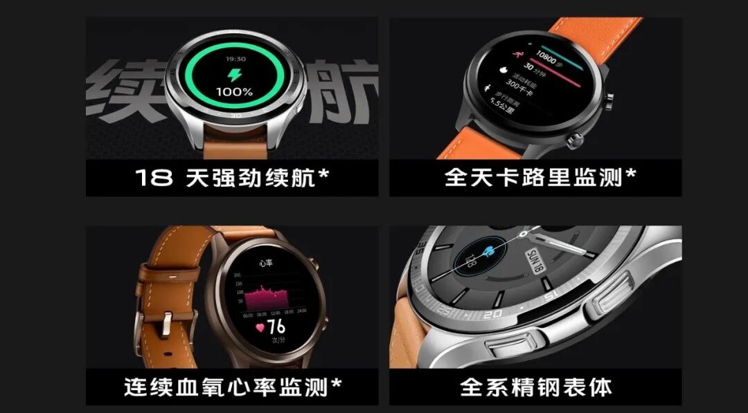 46mm版本提供锋尚银、暗影黑2个配色,提供黑色氟橡胶/棕色真皮2种表带,采用1.39英寸454*454分辨率、326PPI的圆形表盘,手表主体机身46*46*10.6mm,不含表带重46.8g,官网显示购买即送 10W充电器,不额外赠送表带,电池容量为478mAh,日常使用续航最长18天。