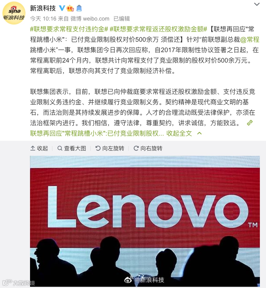 据新浪科技报道,近日联想集团再回应"常程跳槽小米",表示曾与常程签署竞业协议,自2017年限制性协议签署之日起,在常程离职前24个月内,联想共计向常程支付了竞业限制的股权对价500余万元。常程离职后,联想亦向其支付了竞业限制经济补偿。