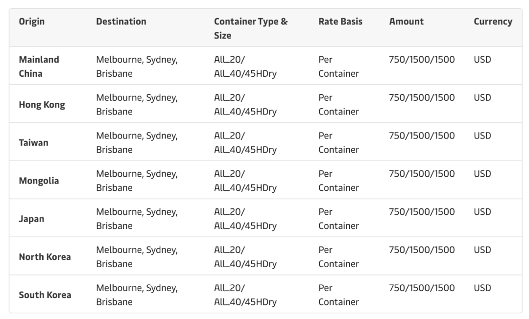 起对从中国大陆、中国香港、中国台湾、蒙古、日本、朝鲜和韩国,到澳大利亚墨尔本、悉尼、布里斯班的所有货物,征收旺季附加费(PSS)。