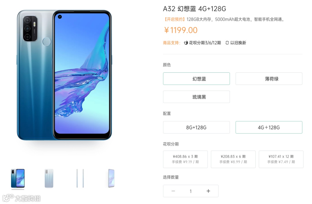 价格上,OPPO A32 4+128GB售价1199元,8+128GB售价1499元,目前已经开启预约,预定可减50元。