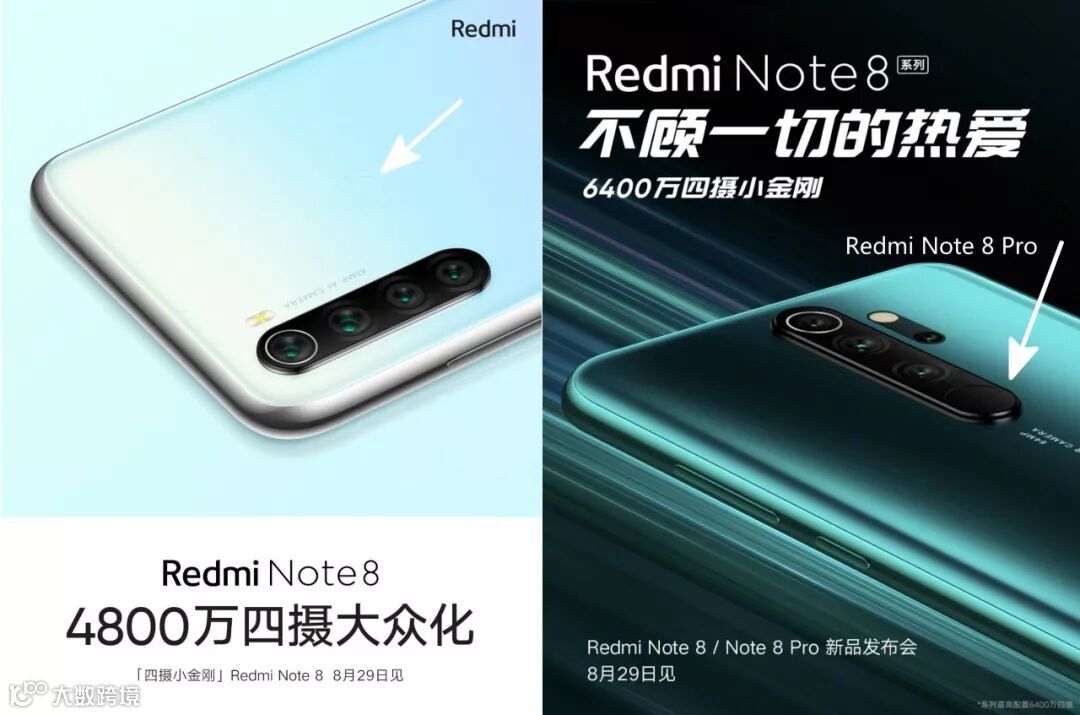 首先是外观上,红米Note 8普通版采用的是左上角竖置四摄,4800万像素主摄,最下面的两颗镜头偏小,没有意外的话应该是两颗200万像素,背部同样是后置指纹,但海报颜色组合给隐藏了起来,不细看看不出。而Pro版是居中设计 三星6400万像素四摄。