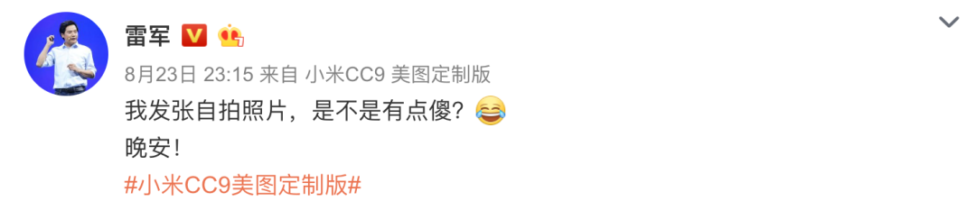 另外,今日小米引起热议的还有雷总的一张自拍,比V手势的自拍搭配小米CC9美图定制版如果是个小姐姐估计是正常画风,但在雷总的表现下,意外有点傻气,Redmi卢伟冰也进行了附和。