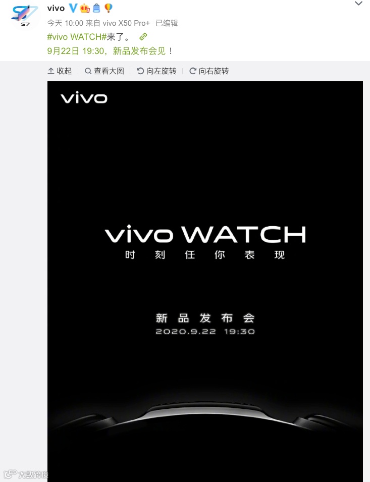 最后,爆料许久的 vivo首款智能手表 终于官宣了,官方表示将于9月22日19:30发布。