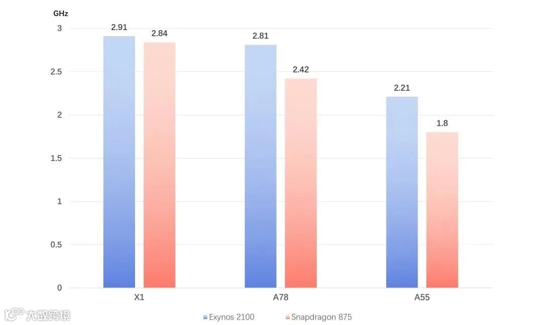 据爆料,三星Exynos 2100的三丛集架构主频分别为2.91Ghz、2.81Ghz、2.21Ghz,而早前曝光的骁龙875主频分别为2.84GHz、2.42Ghz、1.8Ghz。Exynos 2100的主频均高于骁龙875,也就是说三星Exynos 2100理论性能会更强,但功耗势必也会增加。