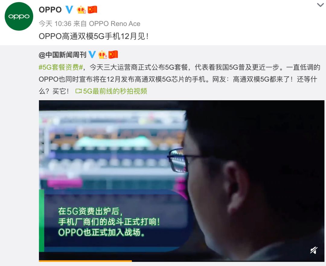 今天上午,三大运营商公布了5G资费,OPPO也借机宣传,正式宣布将于12月发布高通双模5G手机,加速5G普及。
