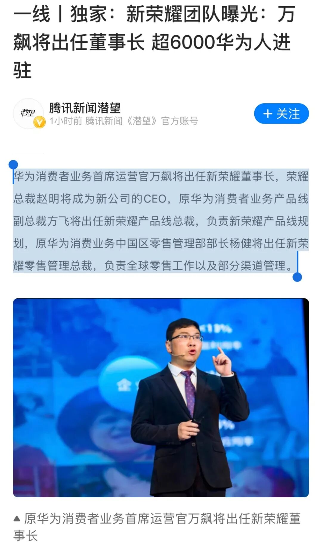 ④原华为消费业务中国区零售管理部部长杨健将出任新荣耀零售管理总裁,负责全球零售工作以及部分渠道管理;⑤知情人士透露“除了万飙过来时带了很多二级干部外,至少有6000以上华为供应链员工加入了新荣耀。”