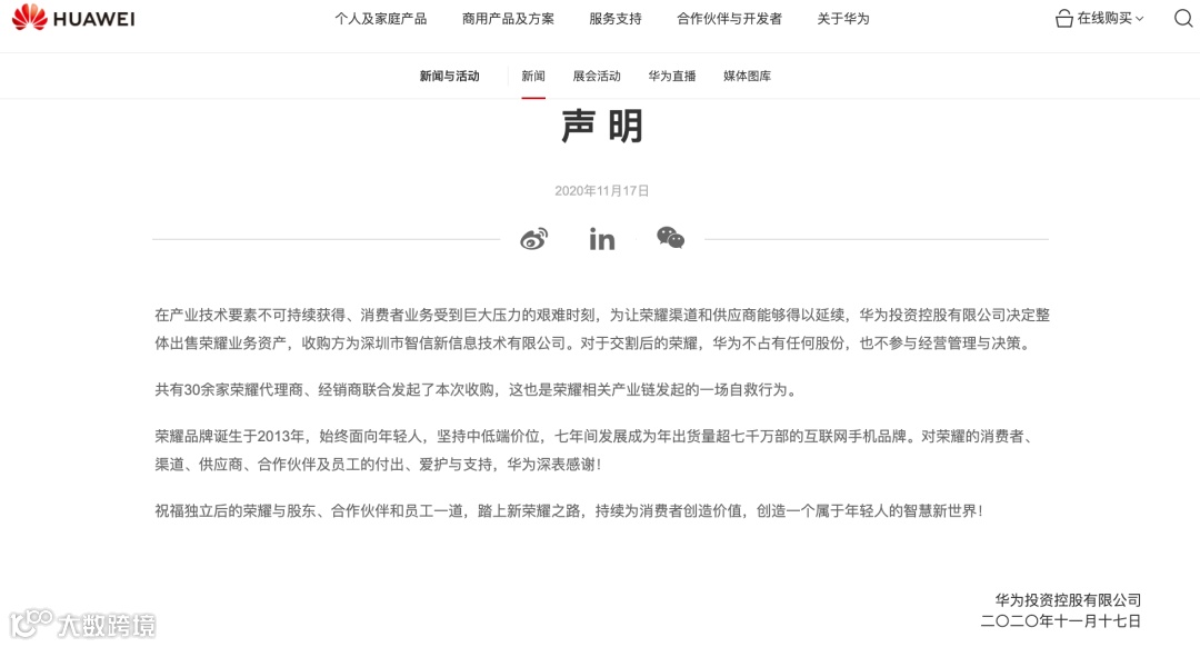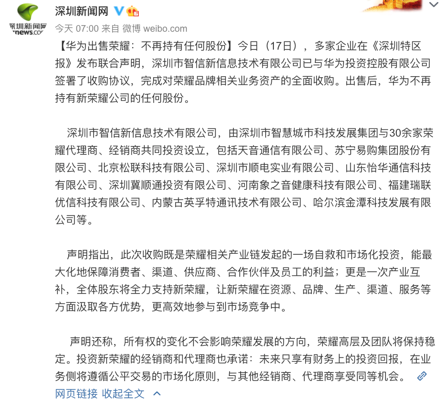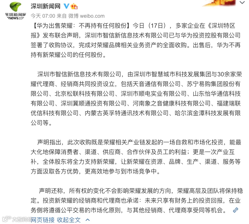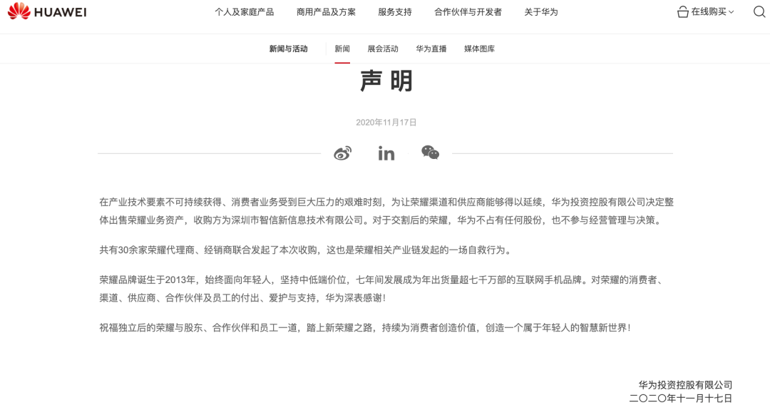 今天上午,华为官方网站发布《声明》:在产业技术要素不可持续获得、消费者业务受到巨大压力的艰难时刻,为让荣耀渠道和供应商能够得以延续,华为投资控股有限公司决定整体出售荣耀业务资产,收购方为深圳市智信新信息技术有限公司。对于交割后的荣耀,华为不占有任何股份,也不参与经营管理与决策。