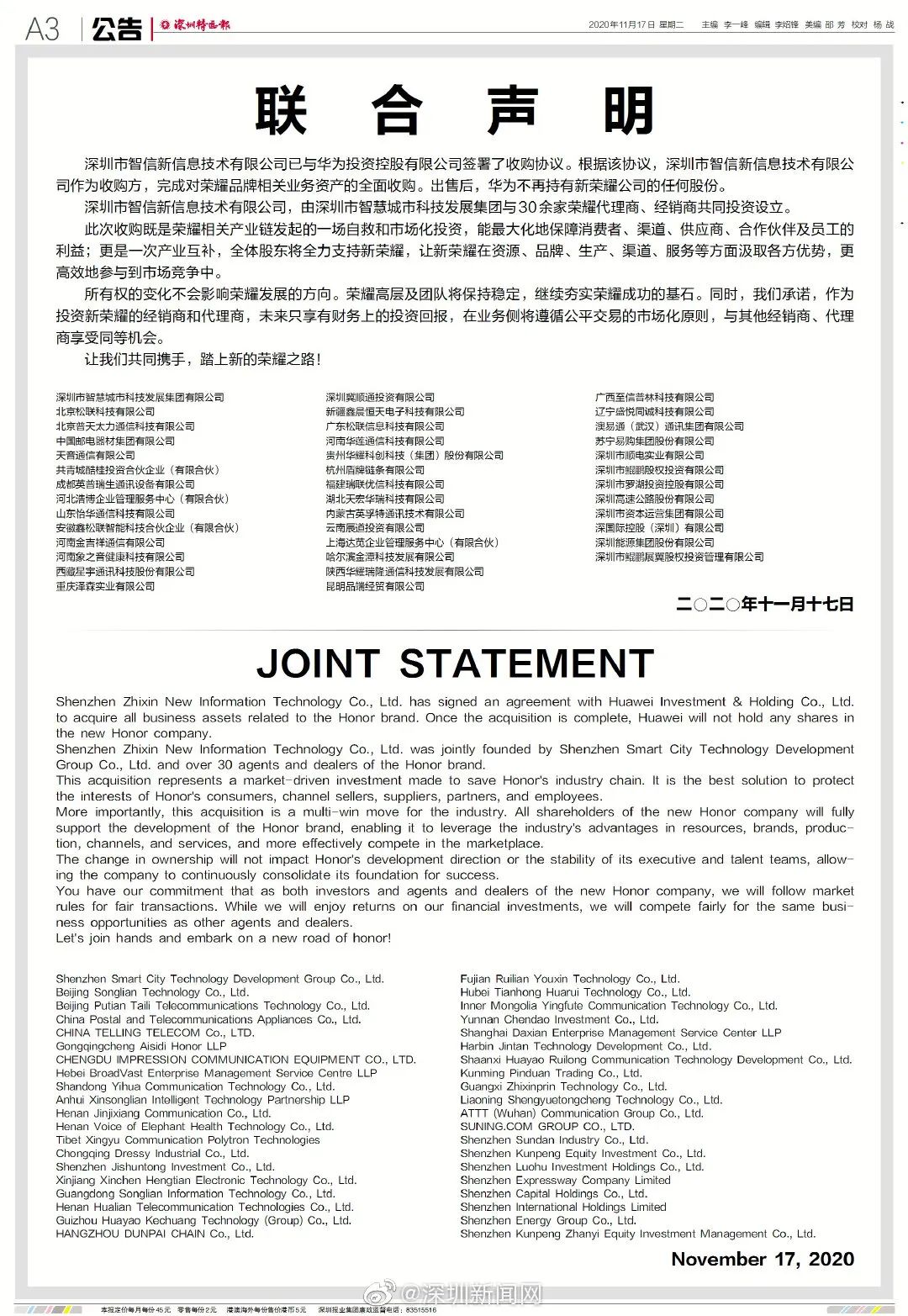 荣耀的收购方并不是传闻中的神州数码,这也导致其开盘一字跌停。今天早上7点,多家企业在《深圳特区报》发布联合声明,表示“这是荣耀相关产业链发起的一场自救行为”。