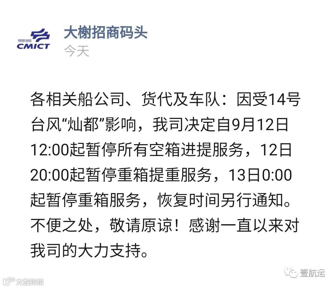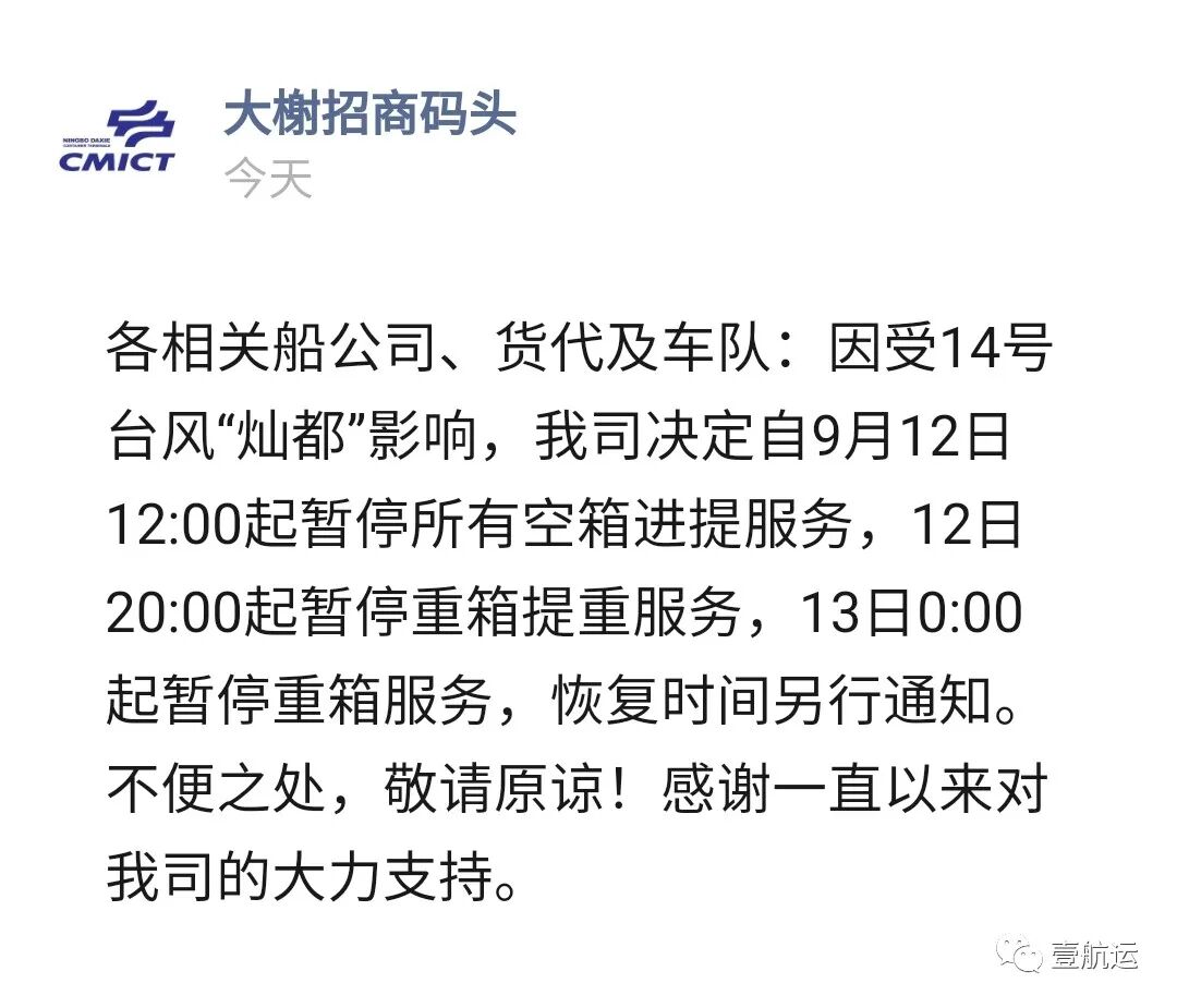因受14号台风“灿都”影响,宁波大榭招商码头决定自9月12日12:00起暂停所有空箱进提服务,12日20:00起暂停重箱提重服务,13日0:00起暂停重箱服务,恢复时间另行通知。