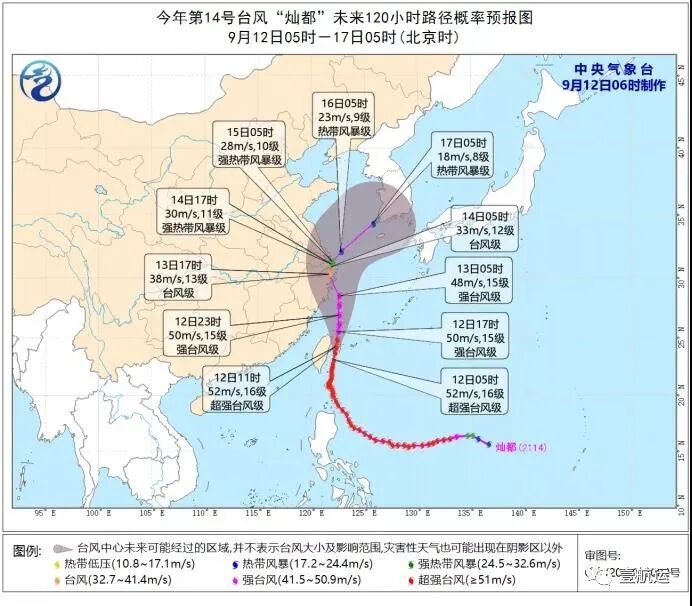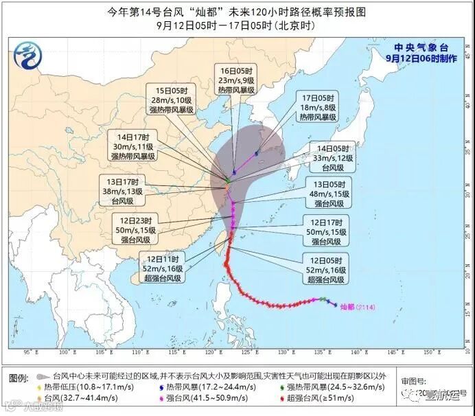今天(9月12日)上午08时,第14号“灿都”已经升级为超强台风!“灿都”中心位于北纬23.7度,东经122.3度,心附近最大风力16级(52米/秒)。