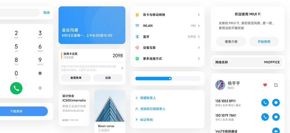 首先是视觉方面,MIUI 11采用和colorOS、Flyme相似基调,用色更为简约,间距更加合适,去除冗余信息,更成熟的现代设计语言,提供多种多样的万象息屏。