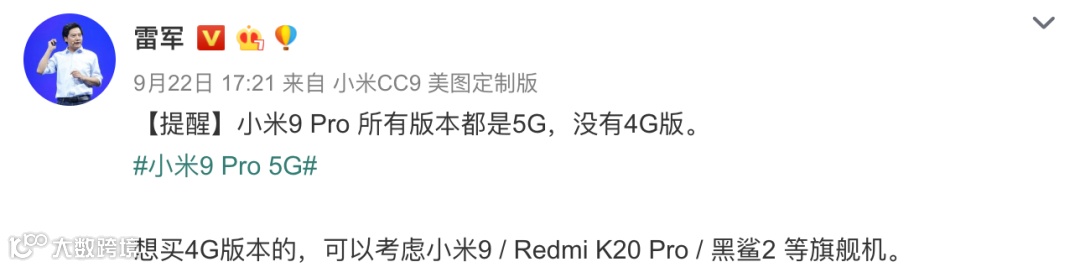 至于大家最关心的版本和售价、开卖时间,雷军表示小米9 Pro所有版本都是5G,没有4G版;发布后一周开卖,估计备货不少;至于价格,雷总表示小米9Pro会比小米9贵不少,成本贵希望大家理解。
