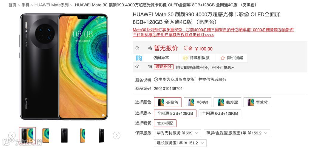 小白看了一下国内官网的预定界面,Mate 30是6+128GB起步,Mate 30 Pro是8+128GB起步,预计国行售价可能4499起步?因为都在传涨价...坐等9月26日揭晓吧。