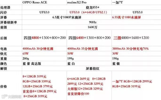 (2)核心不同点:①后置realme是64MP四摄,Ace是索尼48MP四摄,一加7T索尼48MP三摄,主摄支持ois光学防抖的只有一加;②快充:realme 50W,Ace是65W,一加7T是30W;③3.5耳机孔,OPPO和realme保留,一加7T无。④价格及细节体验等也会有小出入。