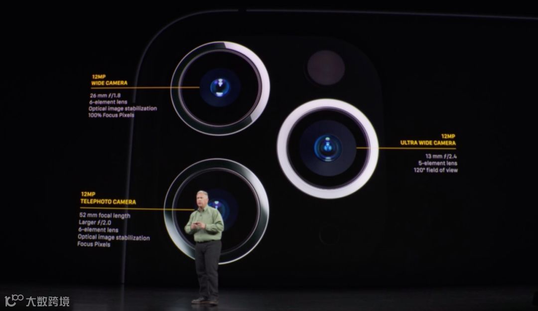 而iPhone 11 Pro则采用后置三摄,3颗1200万像素,镜头分别为F/1.8光圈的广角镜头、F/2.0光圈(上代XS Max是F/2.4)的长焦镜头、以及新增 F/2.4光圈 120° 超广角镜头。新增超级夜景模式。