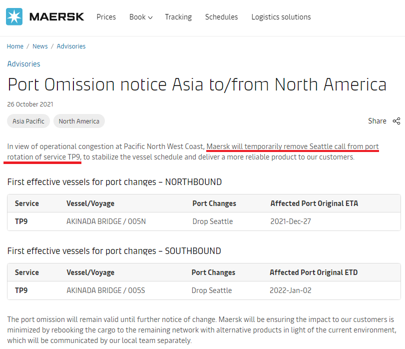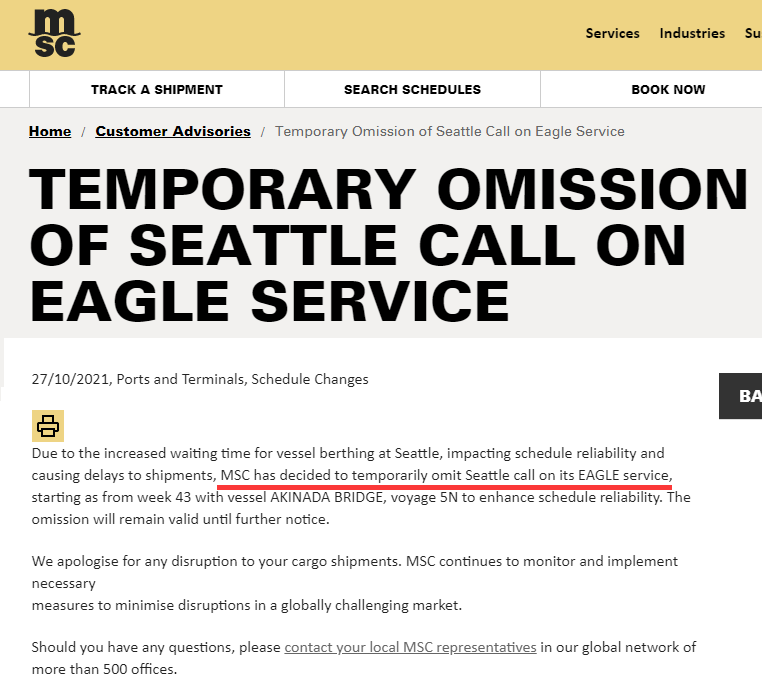 目前,西雅图港船舶等待时间长达28天。随着拥堵蔓延到美国其他港口,由于船舶在西雅图靠泊的等待时间增加,影响了船期可靠性并导致装运延误,马士基、MSC和ZIM宣布,从本周开始,他们将暂时取消TP9/Eagle/ZP9 服务在西雅图港的停靠。以稳定船期并为客户提供更可靠的产品服务。