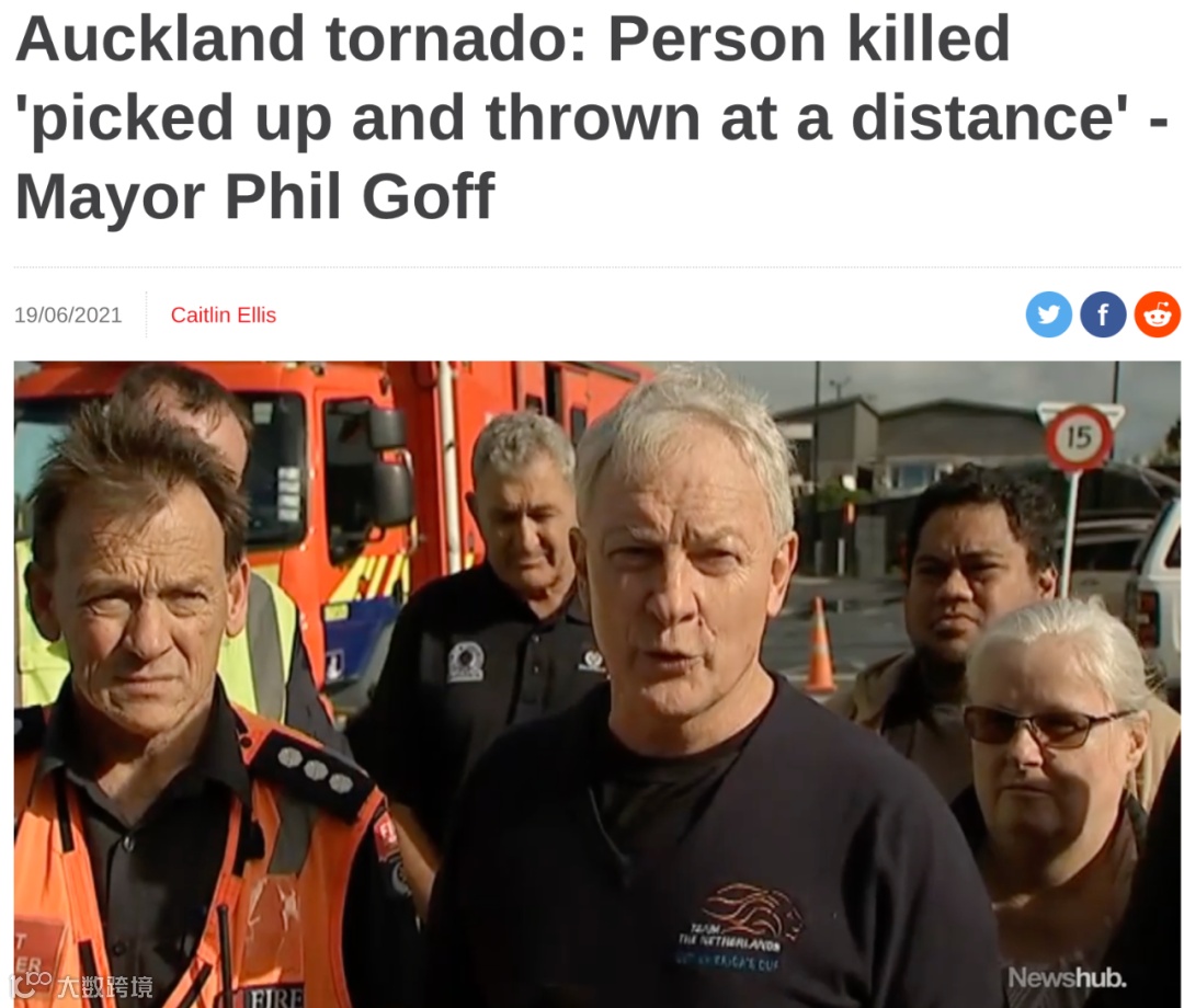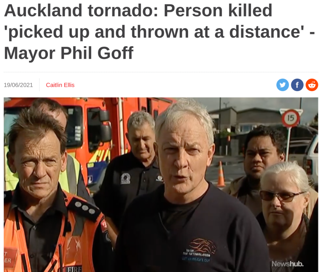 龙卷风还造成一死两伤的后果,奥克兰市长Phill Goff在接受媒体采访时说:“据我所知,这名不幸丧生者是由于被龙卷风卷起抛到远处,撞到一个固体物体造成的。这起事件真的让人非常难过,我们的心与遇难者的家人、朋友与同事同在。”