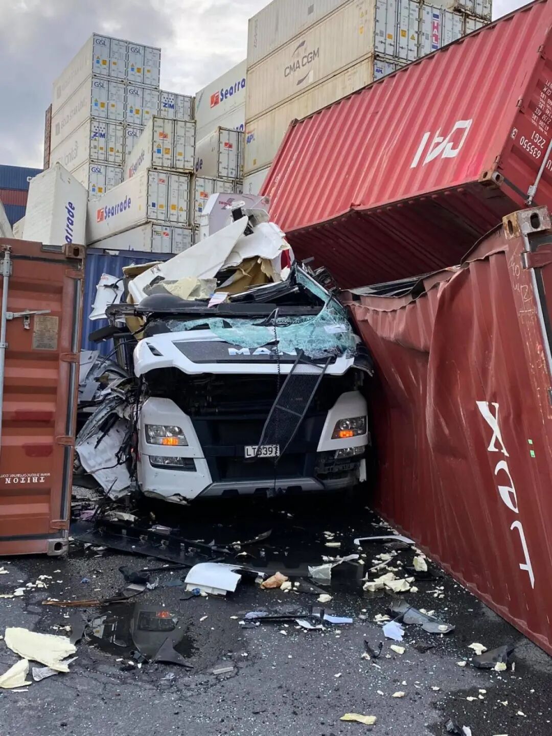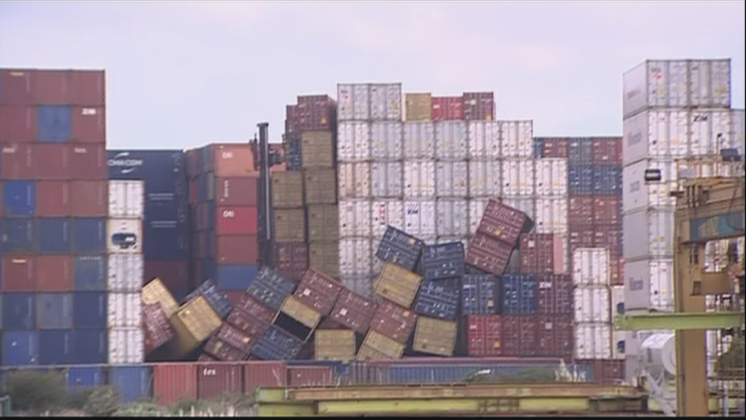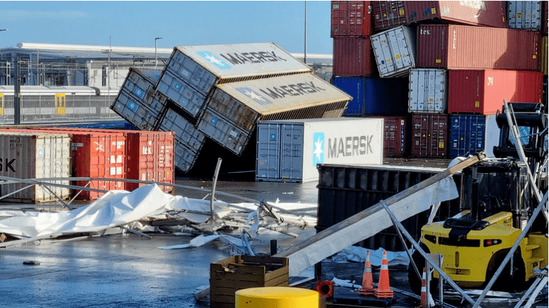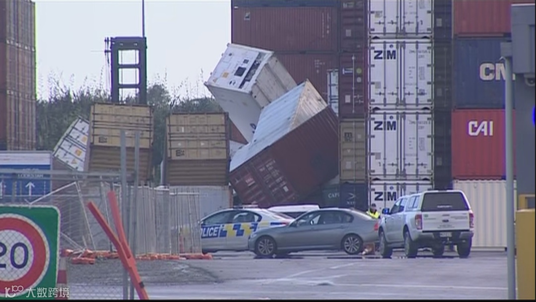 位于Papatoetoe Wiri Station Rd的奥克兰港口码头的集装箱被龙卷风吹倒