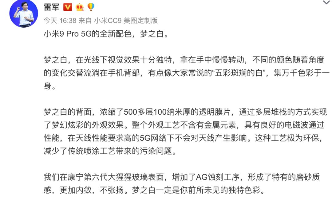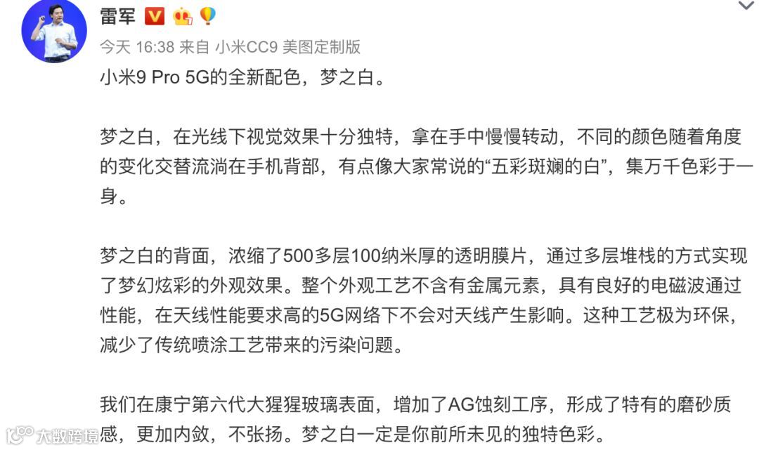 据雷军介绍,小米9 Pro 5G全新配色「梦之白」采用康宁第六代大猩猩玻璃表面,新增AG蚀刻工序,才打造出特有的磨砂质感。