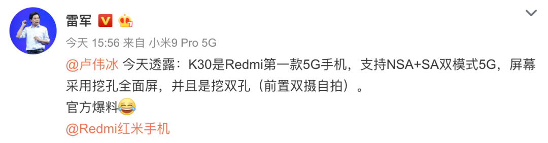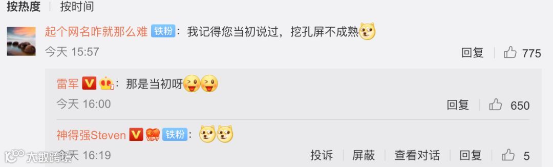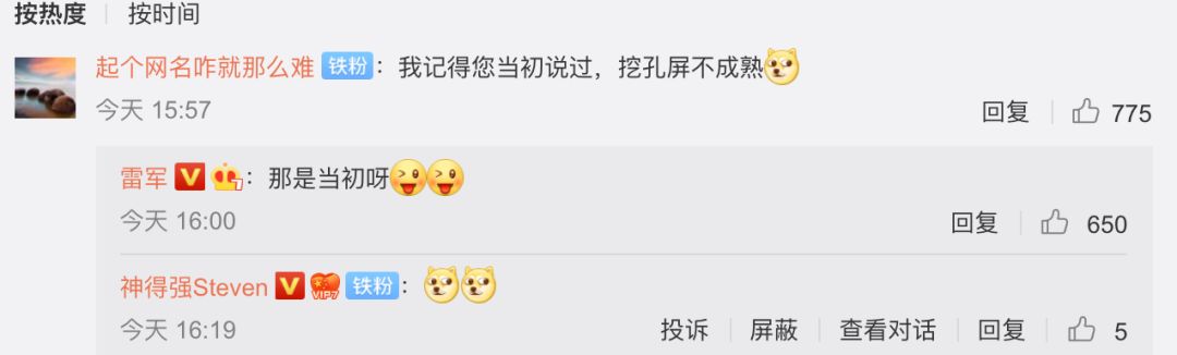 对此雷军也在微博回应小伙伴表示「那是当初呀」,换句话说现在挖孔屏技术成熟了,所以我们用了。