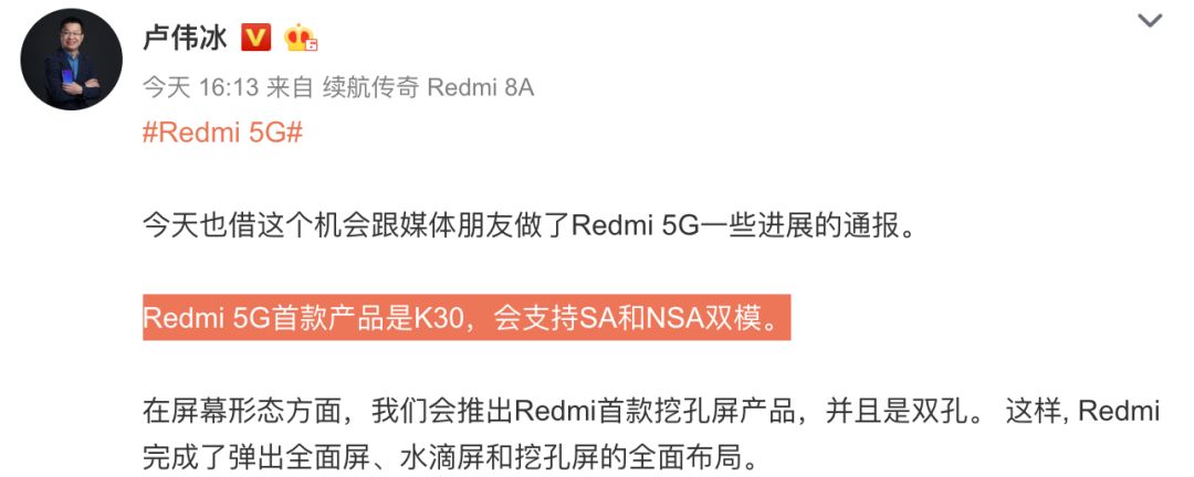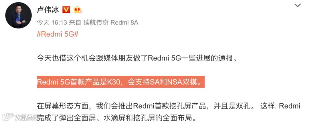今天下午,Redmi 发布了两款入门新机,Redmi 8 和 Redmi 8A,同时也和昨天预热一样,带来了Redmi首款5G旗舰的消息,表示Redmi K30将会是红米首款5G手机,支持NSA和SA两种5G组网方式,也就是大家口中的双模5G手机。