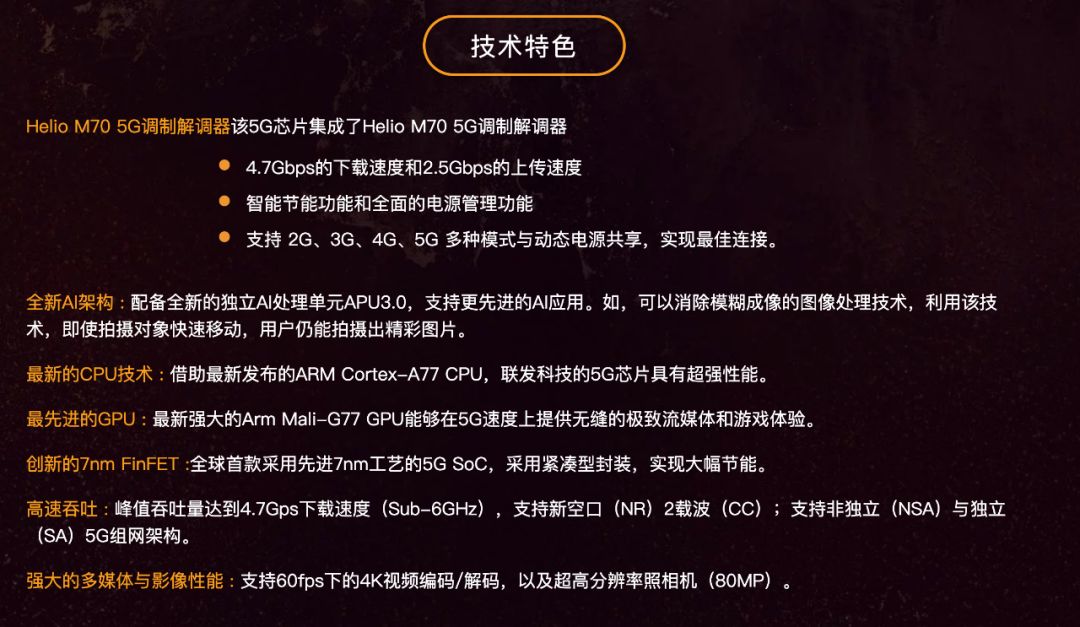 至于联发科的5G处理器,据了解,其内部集成5G调制解调器Helio M70,缩小了整个5G芯片的体积,采用7nm工艺制程,ARM最新架构Cortex-A77 CPU、Mali-G77 GPU和联发科技独立AI处理单元APU,可充分满足5G的功率与性能要求,提供超快速连接和极致用户体验。