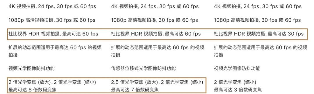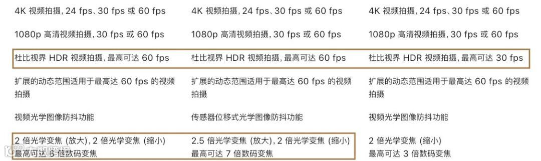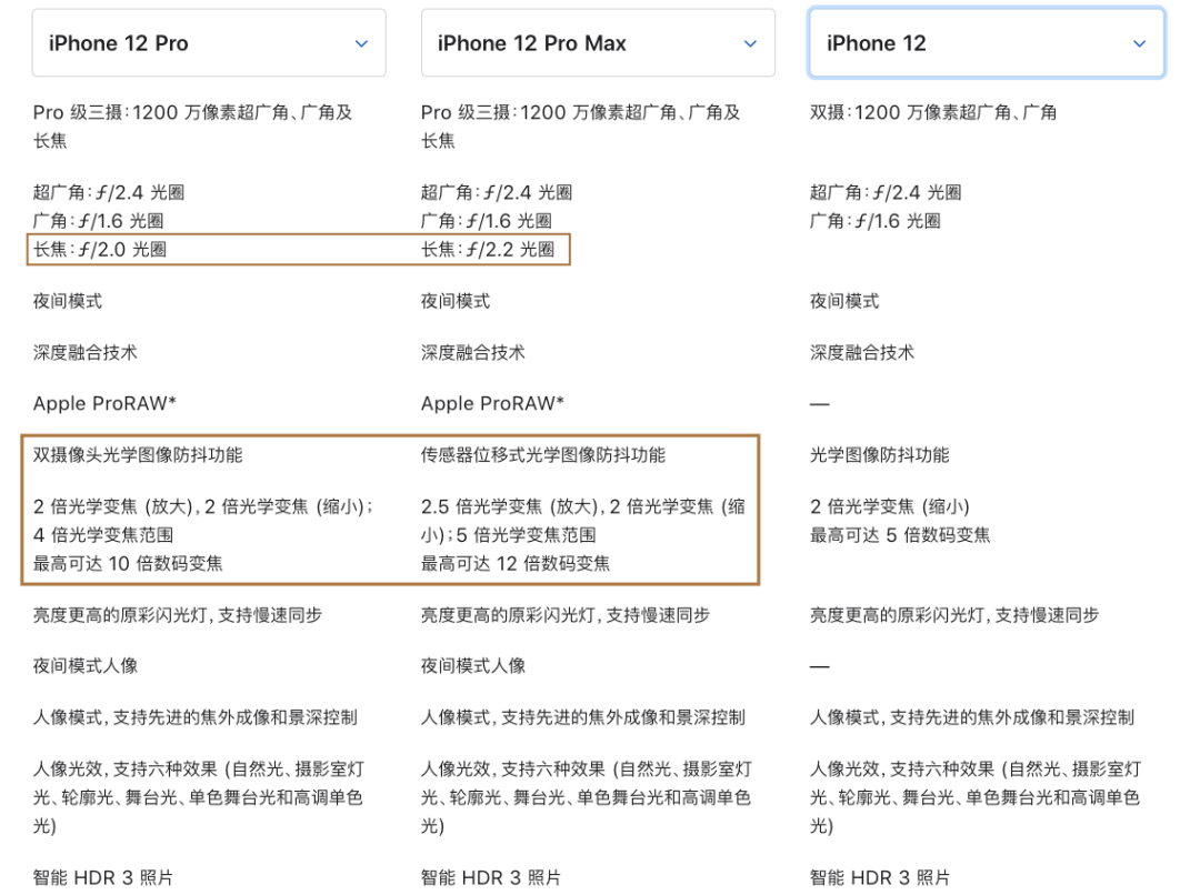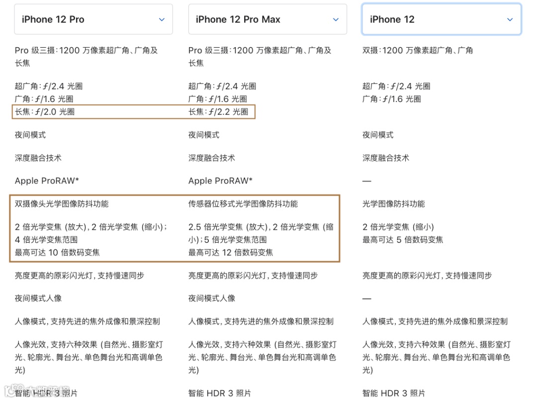 ②后置相机参数:iPhone 12 Pro采用12MP超广角F/2.4+12MP广角 F/1.6 7P镜片+12MP长焦 F/2.0 52mm焦距,4倍光学变焦,最高10倍数码变焦,录像时最大6倍数码变焦;iPhone 12 Pro Max采用12MP超广角 F/2.4+12MP广角 F/1.6 (性能更强大的传感器位移式光学防抖功能,更大尺寸感光元件,高达 1.7 微米像素)+12MP长焦F/2.2 65mm焦距,5倍光学变焦,最高12倍数码变焦,录像时最大6倍数码变焦;