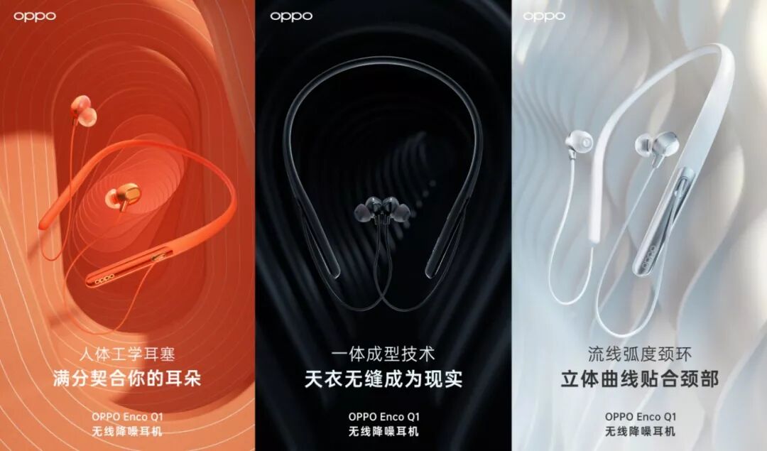 如上图所见,OPPO Enco Q1采用项圈式设计,将提供阳光橙、极夜黑和星辰银3种配色,采用4Mic FF+FB双重主动降噪,预计本月也会登场。