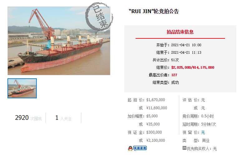 日前,船龄31年的“RUI JIN”散货船在“拍船网”上起拍价167万美元(1.169千万人民币),经过51次竞价后,最终被某国外买家以202.5万美元(1.4175千万人民币)抢得,溢价率达21.3%。