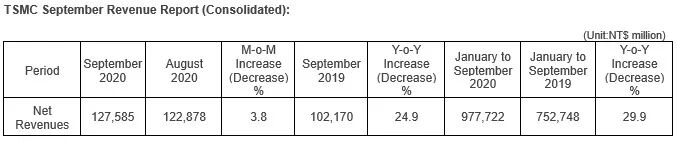 台积电表示 9 月营收同比增长 24.9% 至 1275.9 亿元新台币(相比比 2020 年 8 月增长 3.8%,比去年同期2019 年 9 月增长 24.9%)。2020 年 1 月至 9 月累计营收约为 9777.2 亿元新台币,比 2019 年同期增长 29.9%。