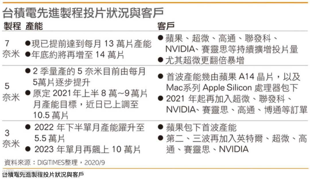 另据之前消息,尽管遭遇疫情和华为禁令危机,但台积电运营依旧稳健,9月中后确定失去华为大单后,其他客户已经填补产能缺口,近期更已上调7nm和5nm月产能,第2季量产的5nm目前由每月5万片逐步提升,原定2021年上半8万~9万片月产能目标,近日已上调至10.5万片,目前首波5nm产能由苹果A14等包下。