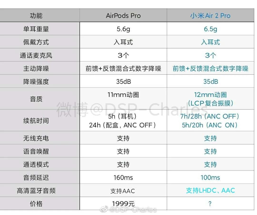 具体规格上,同样是这位博主的消息,其表示小米Air 2 Pro对标AirPods Pro,还晒出了两款产品的配置对比图,表示小米Air 2 Pro支持前馈+反馈混合式数字降噪,12mm动圈,开启降噪模式搭配充电盒续航最长达20个小时,音频延迟低至100ms。