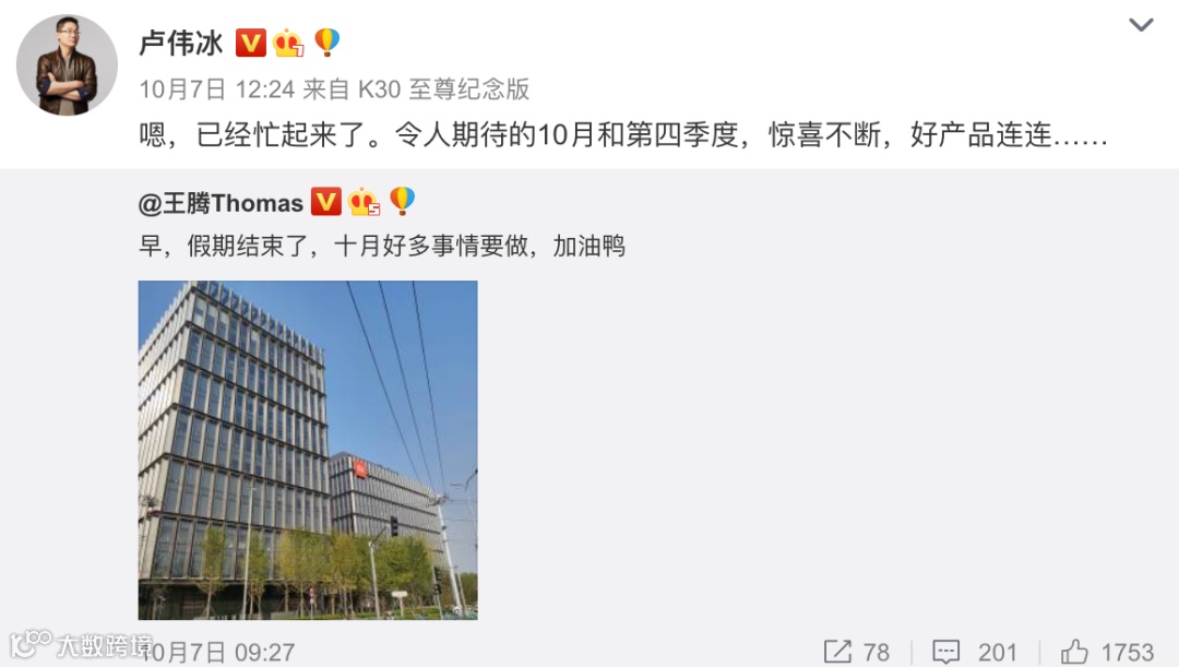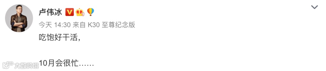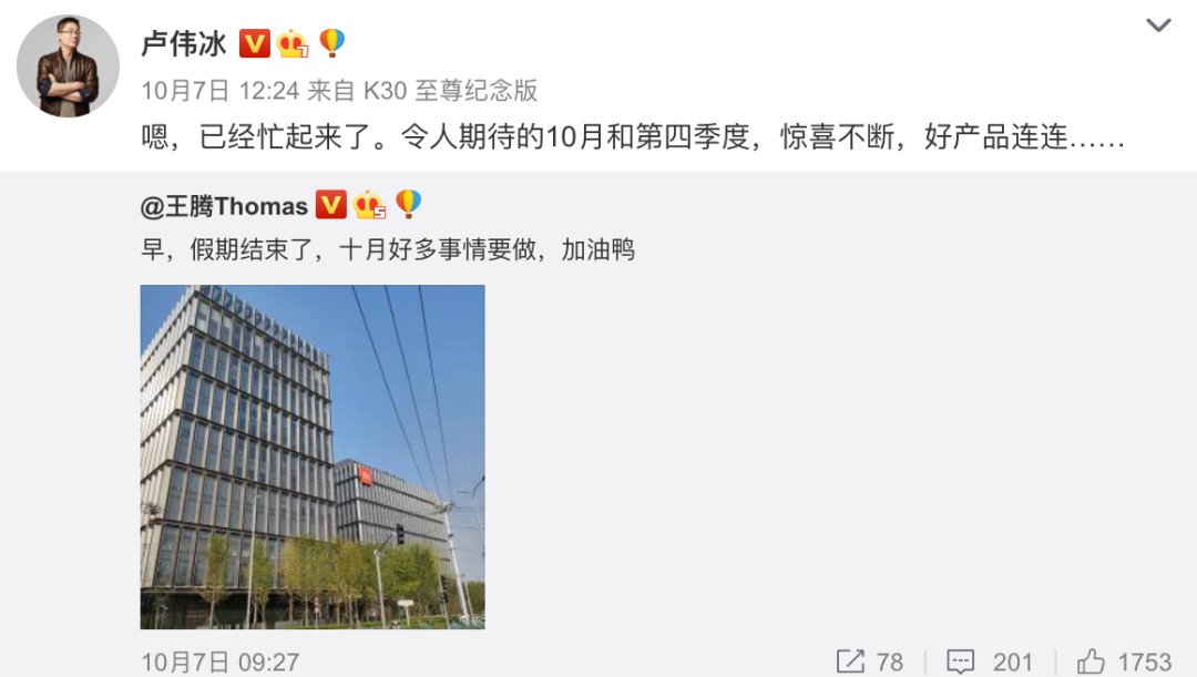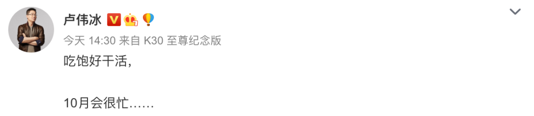 今天是国庆小长假最后一天,Redmi卢伟冰也开始在微博预热节后的10月份会很忙。