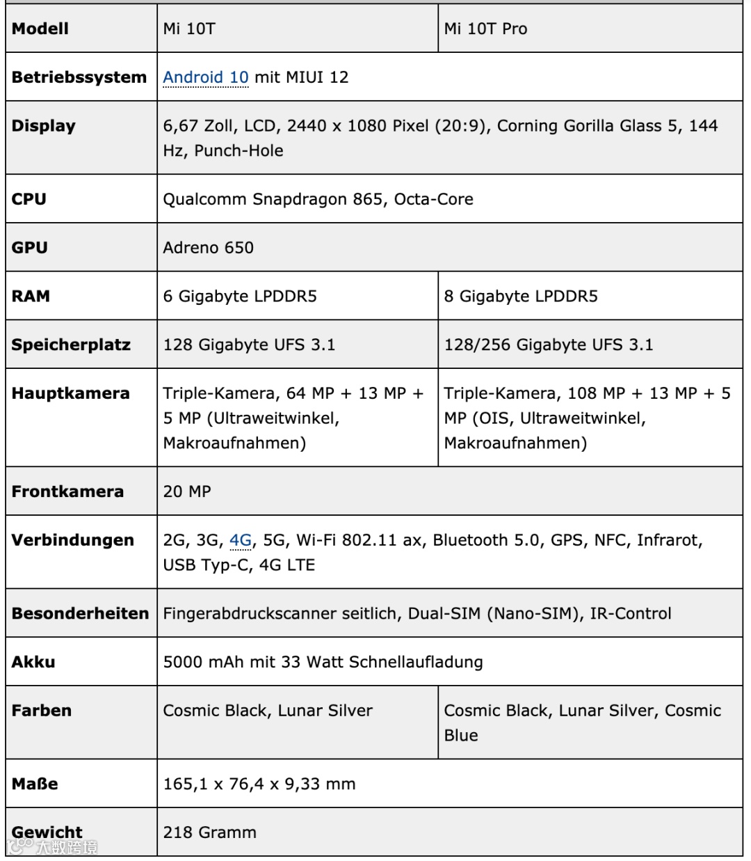 参数上,Redmi K30T / 海外小米10T 采用:前置20MP,后置三摄64MP无ois+13MP超广+5MP微距,骁龙865,LPDDR5+UFS 3.1,5000mAh,33W快充,支持NFC、红外和WiFi 6,无3.5mm耳机孔,X轴线性马达,机身厚9.33mm,重218g。