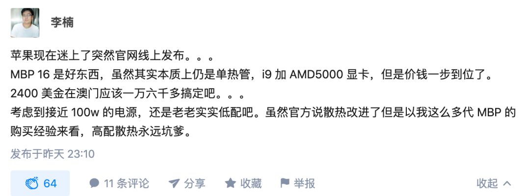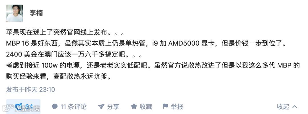 整体来说,16寸的苹果本相当给力,更加Pro化,对小白个人而言,尤其是键盘的改变,键程一毫米虽然不多但总比敲桌子强,还有解码杜比视界的屏幕,地表最强笔记本屏幕无疑了,发了就买。