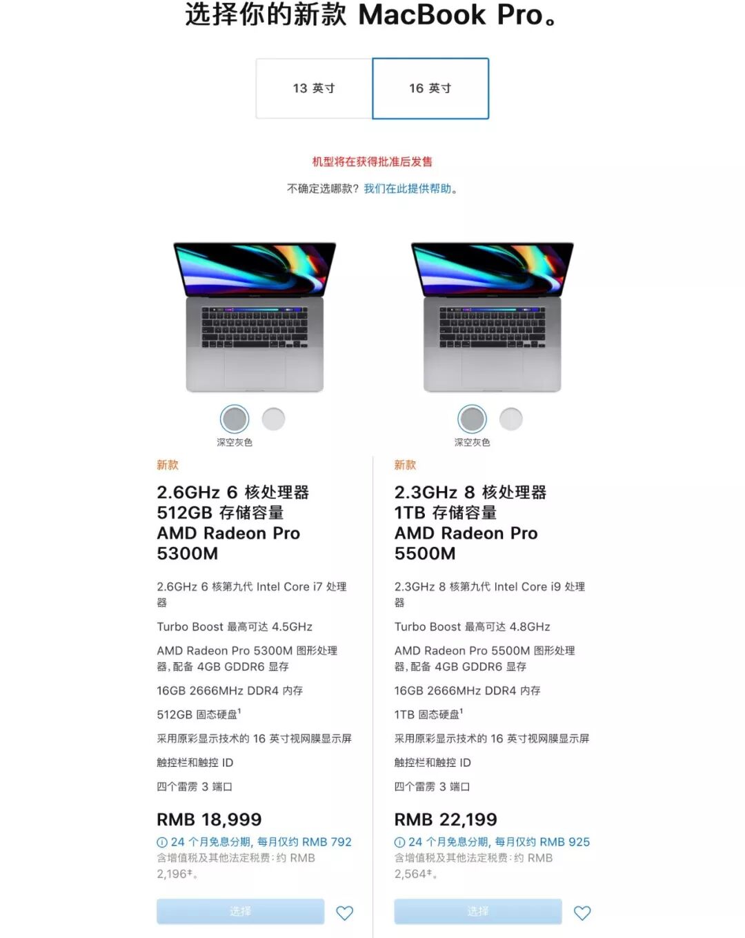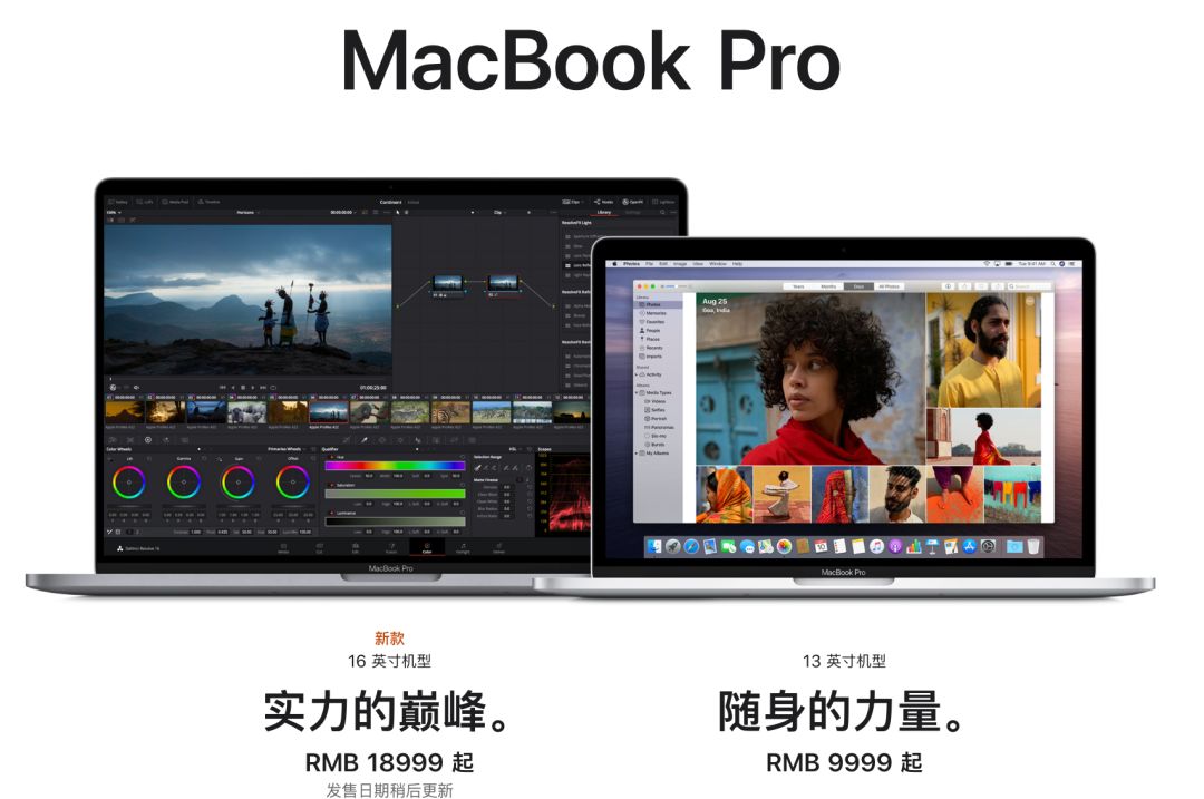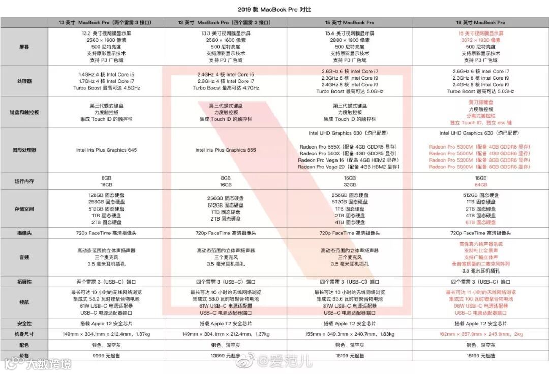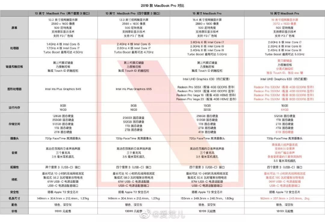 基础参数有:16英寸视网膜显示屏,搭载9代酷睿处理器(6核i7或8核i9)、16GB DDR4-2666内存(最高64GB)、AMD 7nm显卡(最高8GB GDDR6)、512GB~8TB固态盘、提供4个雷电3接口,剪刀式键盘等等。