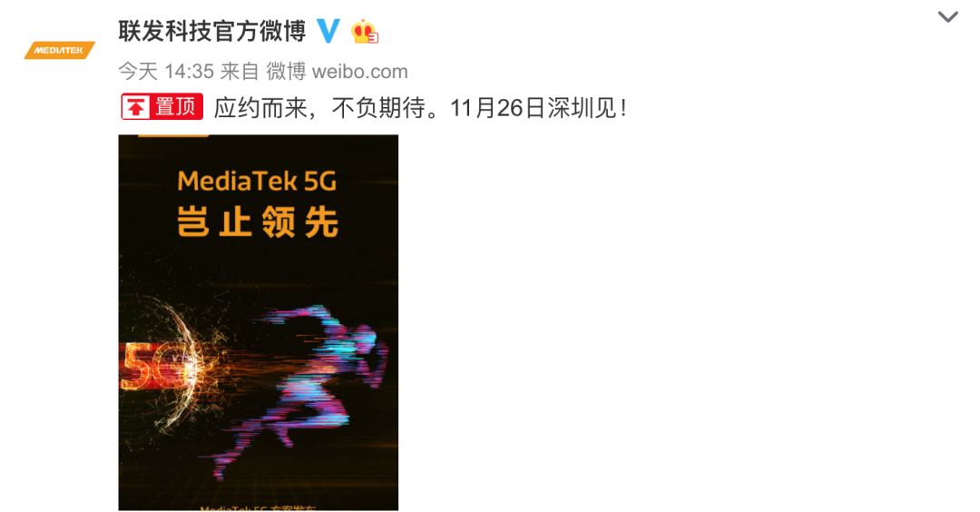 最后,联发科5G SoC下午也正式宣布了发布时间:11月26日,深圳。和荣耀V30系列同天发布。其曾于今年5月份在中国台湾台北电脑展上展出,公布了部分规格,定位旗舰,内部集成5G调制解调器Helio M70,支持NSA和SA,正式发布往往也意味着离量产机型上市不远了~