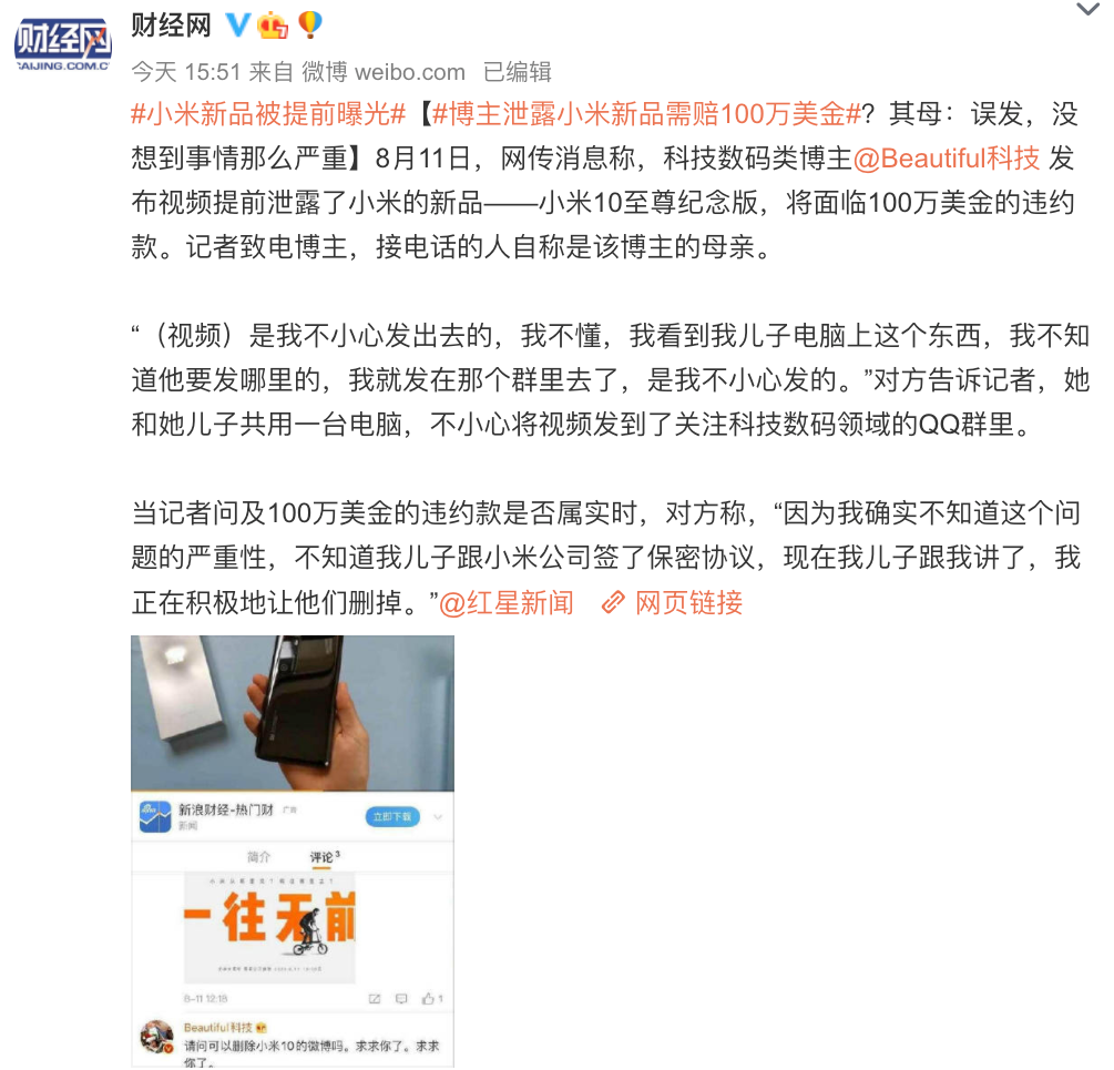 另据财经网报道,记者采访得到的回答是:视频系泄密者母亲误发。“其母亲接听电话表示她和她儿子共用一台电脑,不小心将视频发到了关注科技数码领域的QQ群里。当记者问及100万美金的违约款是否属实时,对方没有正面回应,称“我不知道问题的严重性,不知道我儿子跟小米签了保密协议,现在我儿子跟我讲了,我正在积极地让他们删掉。”
