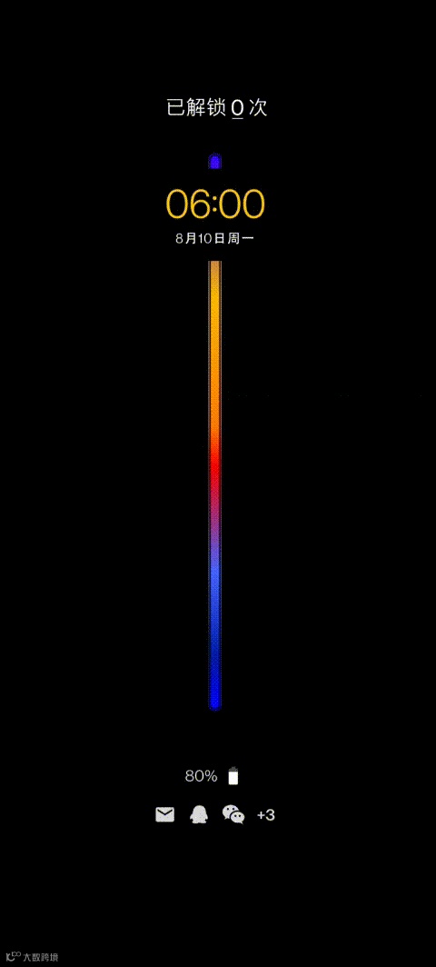 另外一点就是我个人非常喜欢的「时光AOD」,其息屏下看似是一条普通的彩色线条,但其实是一条时间线,可以实时显示当下你解锁了多少次手机,每次使用手机的时间 都会具化为线条的长度,让大家更好地知道自己的时间轴,情感和秩序的融合。不过有部分小伙伴担心可能存在烧屏问题,这点还需要观望一下。