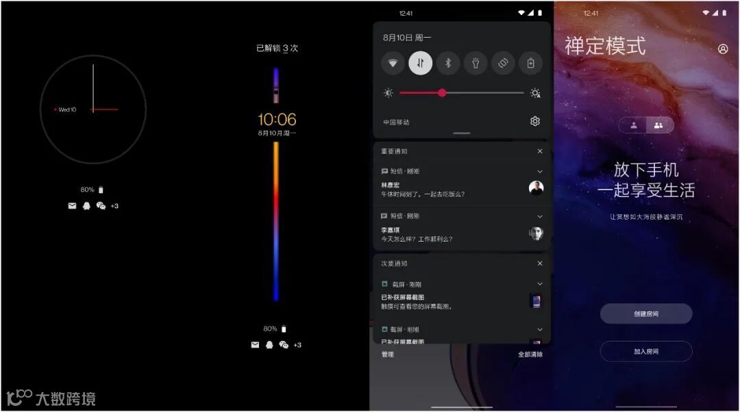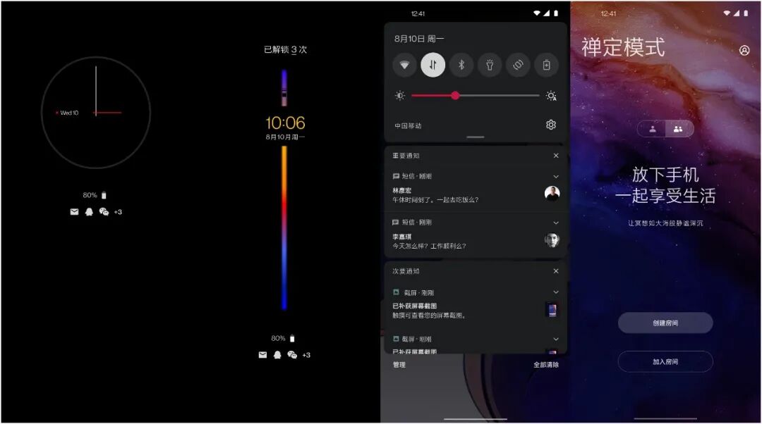 此外,一加氢OS 11还带来了「多人禅定模式」,一加用户可以创建房间,来邀请好友(可一加用户,也可以是其他品牌手机的用户)通过QQ等主流平台登录进入房间,然后开启「多人禅定」,放下手机回归生活。