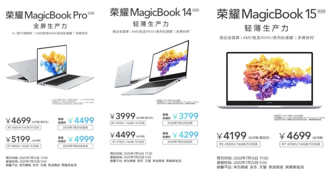 -笔记本电脑,荣耀MagicBook Pro锐龙版首销价4499元起;荣耀MagicBook 14锐龙版首销价3799元起;荣耀MagicBook 15锐龙版售价4199元起。(具体配置大家可以到官网了解,用小伙伴的话说 对标联想小新锐龙版系列的话似乎还差一点点,单总结的话AMD Yes就完事了)