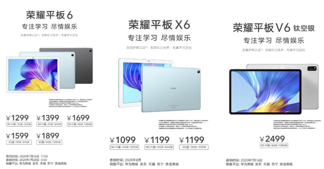 -平板电脑 荣耀平板6售价1299元起;荣耀平板X6售价1099元起;荣耀平板V6钛空银版2499元;荣耀平板V6之前有汇总完整参数麒麟985戳蓝字跳转查看,而荣耀平板6和荣耀平板X6搭载中芯国际代工的麒麟710A处理器。