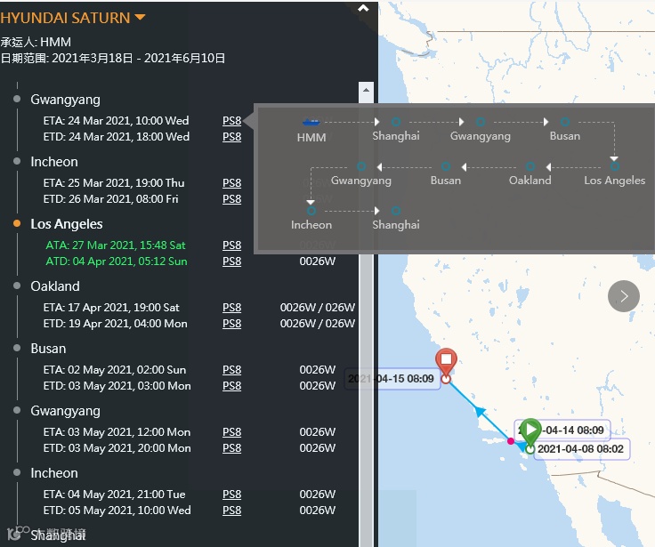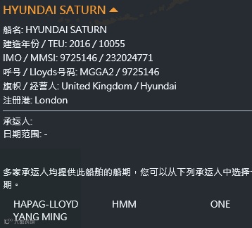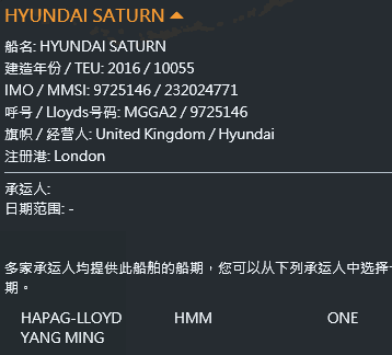 大船期资料显示,“Hyundai Saturn”轮运力为10055TEU,服务于南太平洋PS8航线,共舱的还有同联盟的船司。