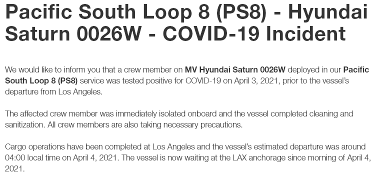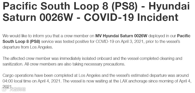 据船公司公告,这条船同样是服务于跨太平洋航线的“Hyundai Saturn”轮,船只在离开洛杉矶之前,一名船员于2021年4月3日被检测出COVID-19阳性。