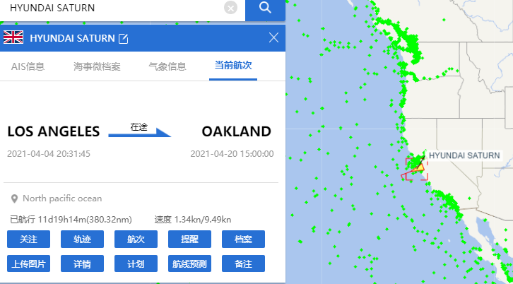 该船目前已经离开洛杉矶,在去往奥克兰的途中。