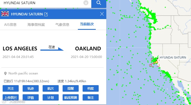 据悉,该轮在洛杉矶的货运业务已经完成,预计将于2021年4月4日当地时间04:00左右启航。自2021年4月4日上午以来,这艘船一直在洛杉矶锚地等待。