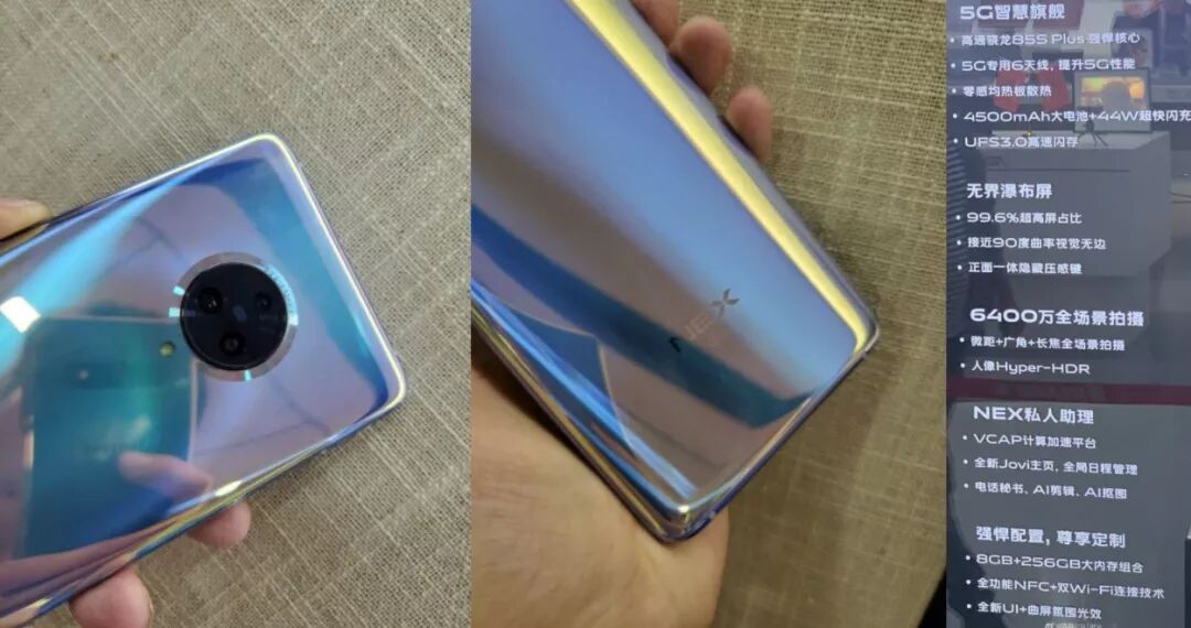 曝光的配置表还显示,vivo NEX 3 5G将搭载高通骁龙855Plus+6根5G专用天线以增强5G性能;4500mAh+44W快充,8+256GB,标配UFS 3.0闪存;屏占比99.6%的无界全面屏+隐藏式压感键。6400万像素后置三摄,全新的NEX私人助理、全功能NFC+双WiFi,坐等明晚正式发布了~