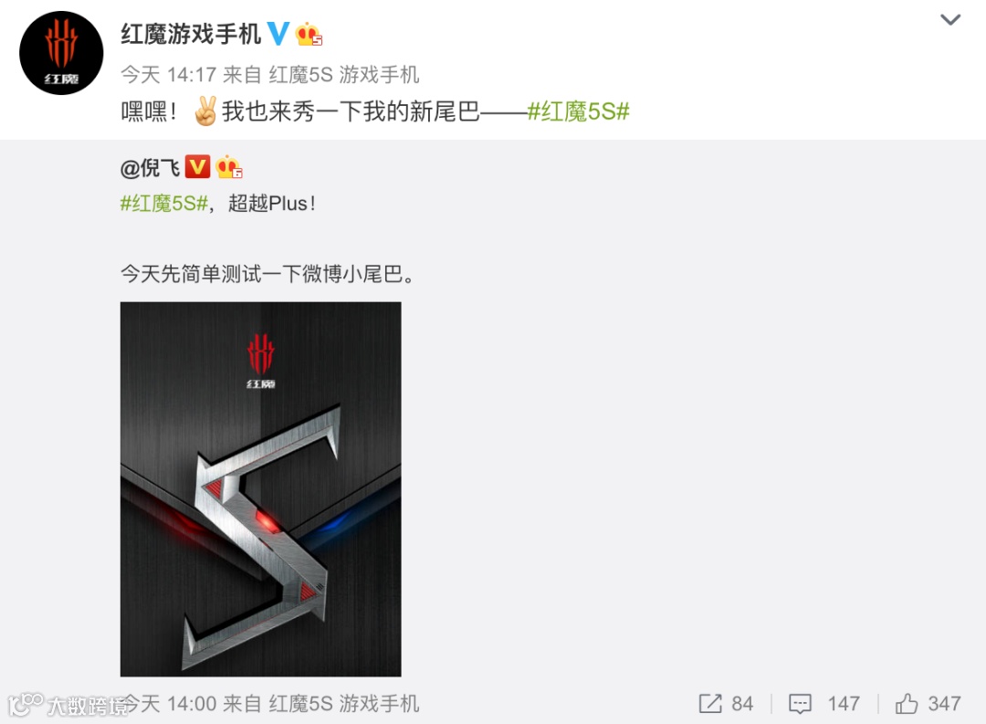 如上图所见,红魔倪飞晒出了新机红魔5S的海报和微博小尾巴,海报宣传语是「红魔5S 超越Plus」,应该也是暗示骁龙865 Plus,稍微有点尴尬的是,红魔海报这个S的图标有点像隔壁友商黑鲨的logo