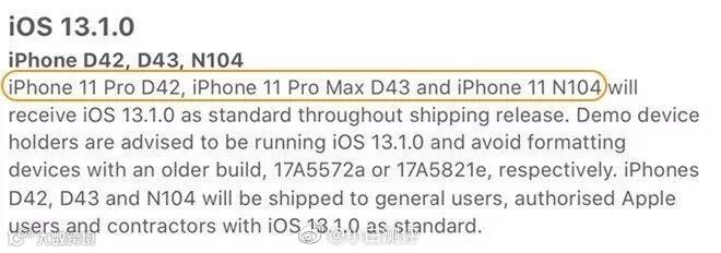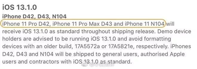 之所以认为最新曝光的 iPhone12,3 对应的是 iPhone 11 Pro , iPhone12,5 对应的是 iPhone 11 Pro Max,是因为此前外媒曝光的 iOS 13 内部资料图(图 3)显示:iPhone 11 Pro 是 D42,iPhone 11 Pro Max 是 D43 ,iPhone 11 是 N104。